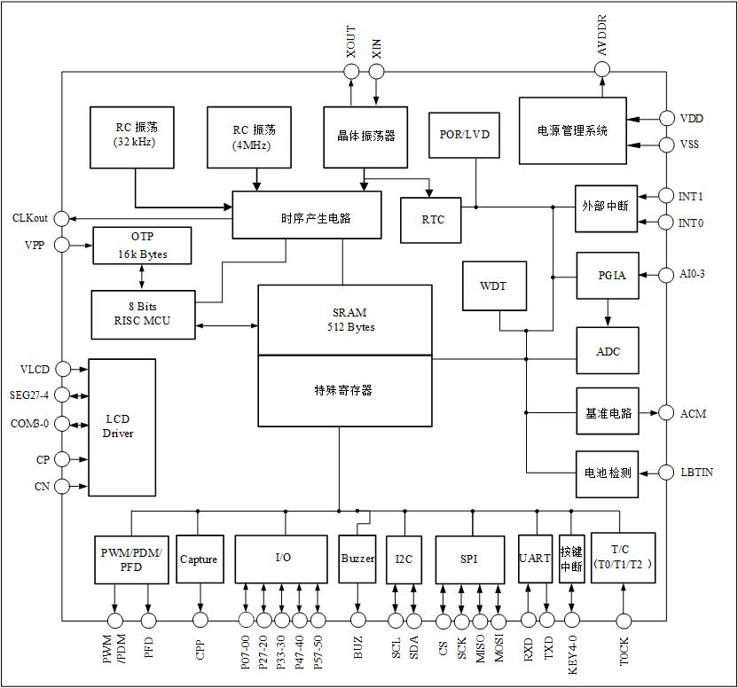本芯片是高精度24位ADC的SoC产品,外围资源丰富:RTC,可选的多种稳压电源输出,灵活设置的PGIA模块,升压模块, UART、I²C、SPI、TIMER、PWM/PDM、PFD、CAPTURE输出模块,LCD驱动等。