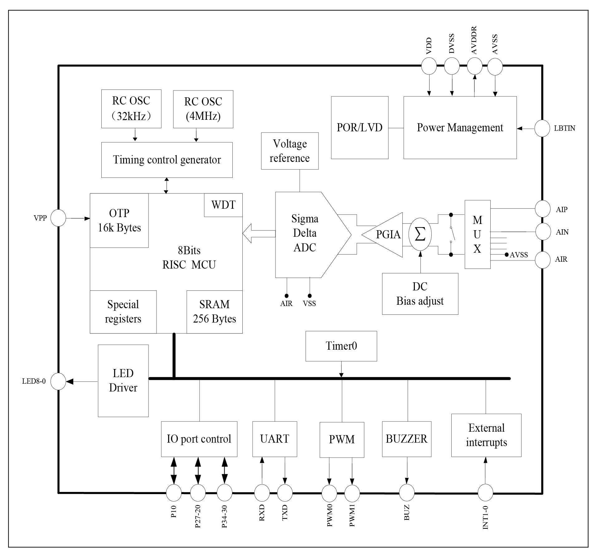 8 bits RISC ultra low power MCU, 49 instructions and 6 stack levels. The MCU current consumption is 600μA typically at 3V and 2MHz operating clock rate, 2μA at standby and 32kHz clock, and 1μA at sleep